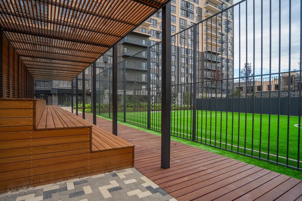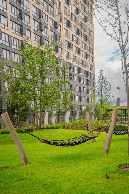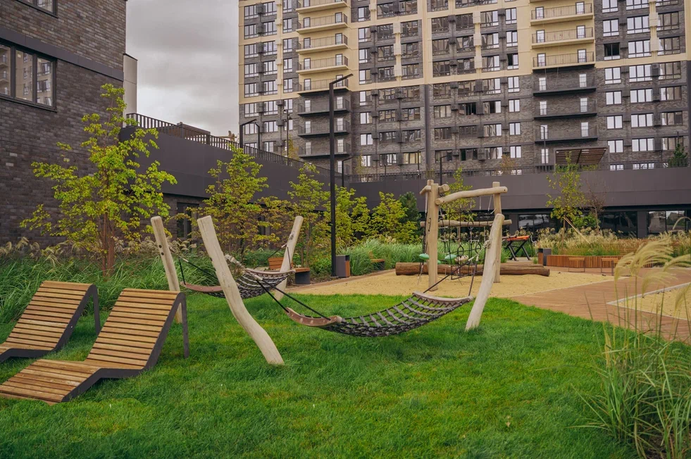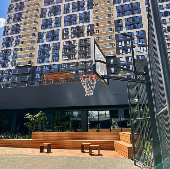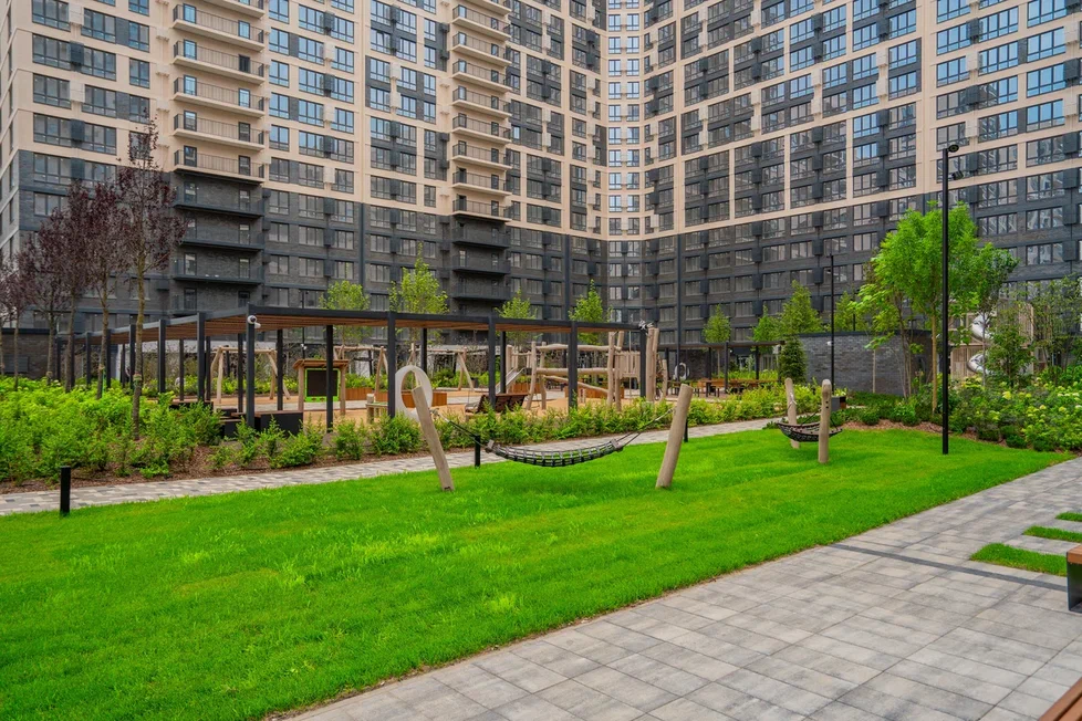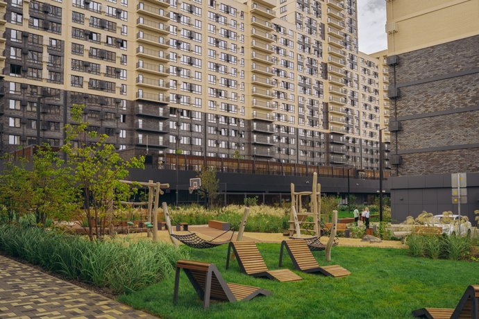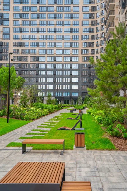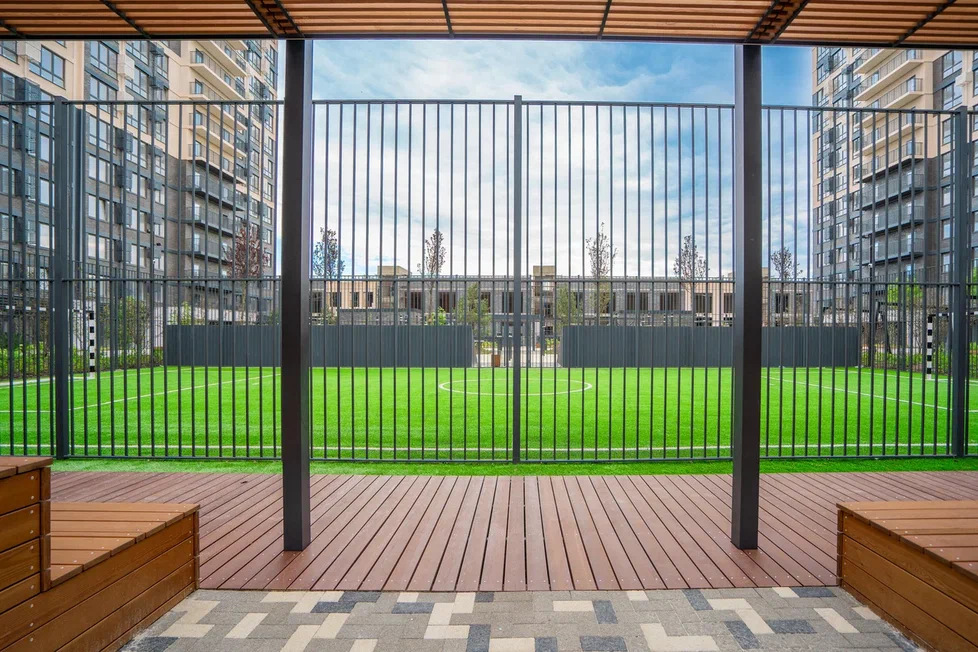 Ваш двор в ЖК «Гарантия» — это просторный парк с японскими кленами, цветущими сакурами и уютными зонами отдыха у фонтанов. Здесь есть всё для активного отдыха: футбольное поле, теннисные корты и йога-платформа на берегу озера с живописной набережной. Круглосуточная охрана с системами видеонаблюдения обеспечивает безопасность и спокойствие. А на всей территории комплекса действует бесплатный Wi-Fi.