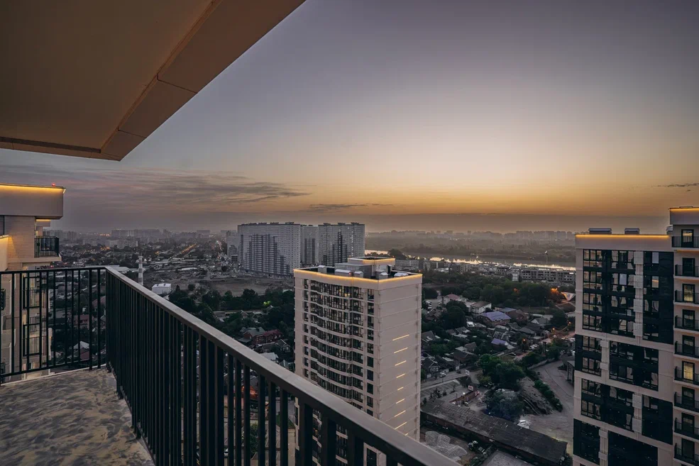 Откройте панорамное окно — и вашим личным достоянием станет вечно живая картина: плавное течение Кубани, бескрайний изумрудный ковер заповедника «Красный кут», персиковые закаты над горизонтом и мерцающие огни центра Краснодара. Туманные утра над рекой, игра света на воде днем, вечернее зарево города — это не просто пейзаж, это ваше личное пространство гармонии и энергии.