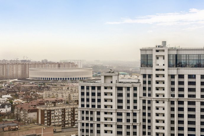Откройте панорамное окно — и Краснодар ляжет у ваших ног. На рассвете вы видите, как первые лучи золотят купола Екатерининского собора. Ночью — подсвеченные городские мосты и огни стадиона «Краснодар». С 23-го этажа, где расположены фитнес-клуб с бассейном и ресторан, город кажется живым организмом, а вы — его пульсом .