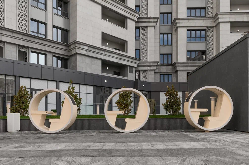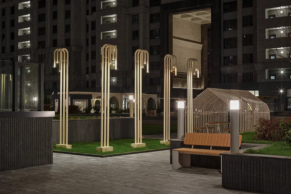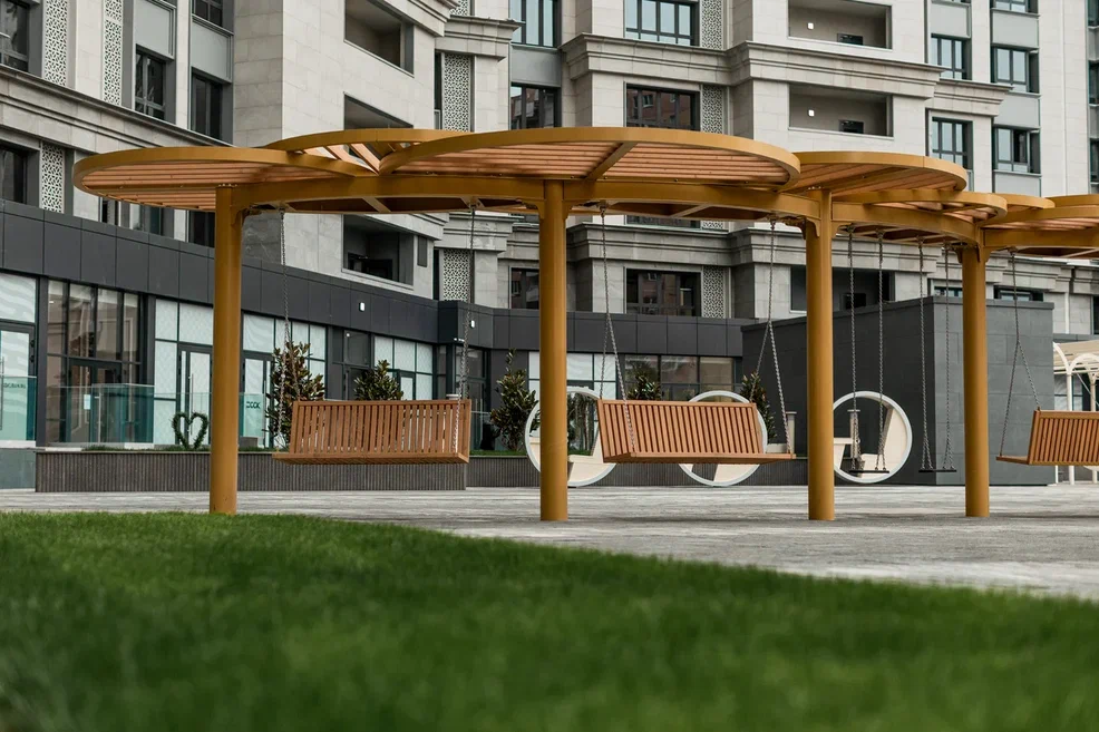 Двор расположен в стилобатной зоне, изолирован от машин и внешних улиц. Попасть можно через входную группу и холл. Лестницы и дорожки подогреваются. Здесь нет случайных прохожих — только ваши соседи. Детские площадки — не просто горки, а интерактивные пространства с мягким покрытием и игровыми модулями будущего.