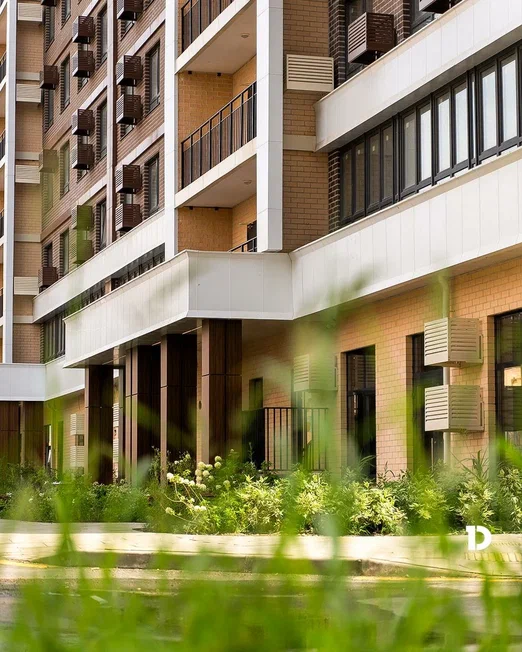 Комплекс состоит из 36 монолитно-кирпичных домов высотой от 16 до 19 этажей. Фасады выполнены в светлых теплых оттенках — от бежевого до коричневого — с панорамным остеклением на верхних этажах. Дома расположены на значительном расстоянии друг от друга, что создает ощущение простора и света. Архитектура выдержана в современном стиле с минималистичными акцентами и использованием натуральных материалов.