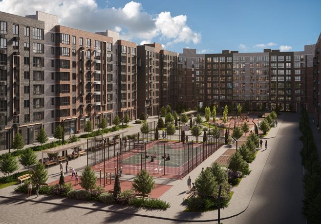Спортивные зоны включают в себя площадки для занятий футболом, баскетболом, воркаутом и другими активными видами спорта для всей семьи.
