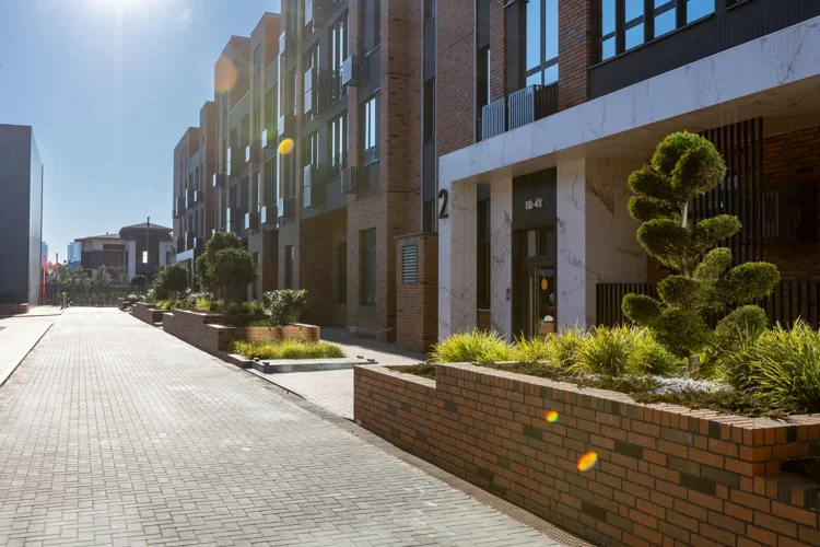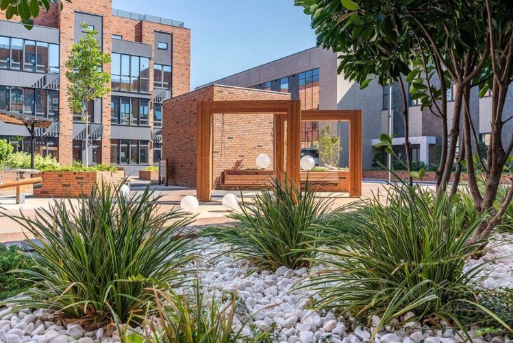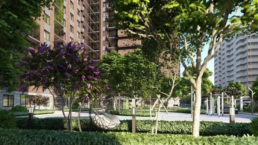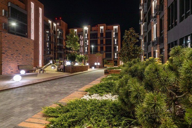 Роскошное, пышное озеленение – настоящее произведение ландшафтного искусства. Здесь можно прогуляться по аллеям с сакурами и павловниями, заняться йогой или отдохнуть в тени под перголами.