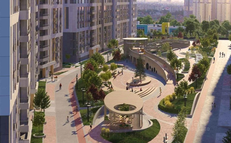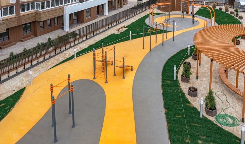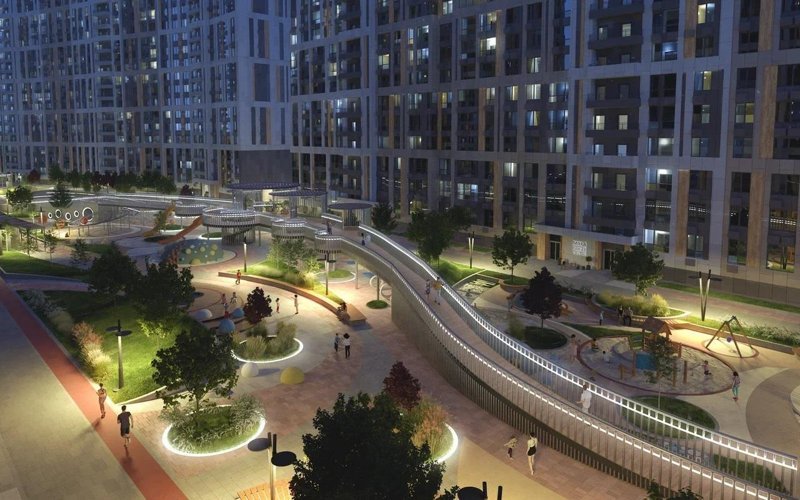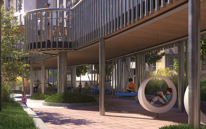 Зелёный двор на стилобате включает более 30 функциональных зон: пешеходный мост 126м без ступеней, амфитеатр для собраний и общих праздников, фотозона с иллюминацией, плейхабы, воркаут и беседки в тени для отдыха. Продуманное зонирование позволит каждому независимо от возраста и увлечений провести время на свежем воздухе в свое удовольствие.