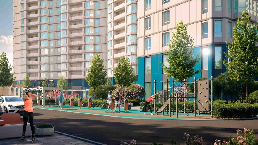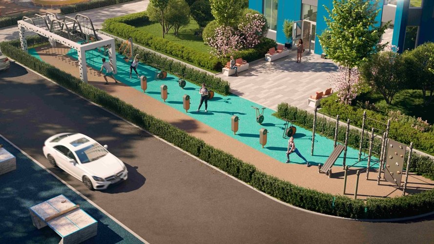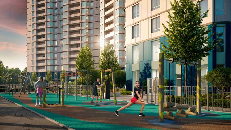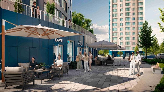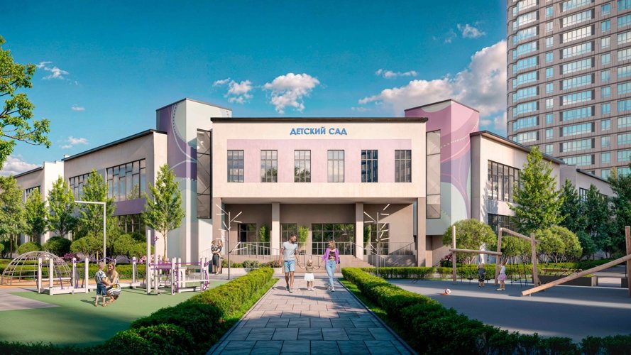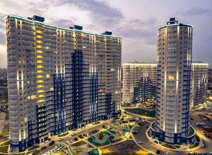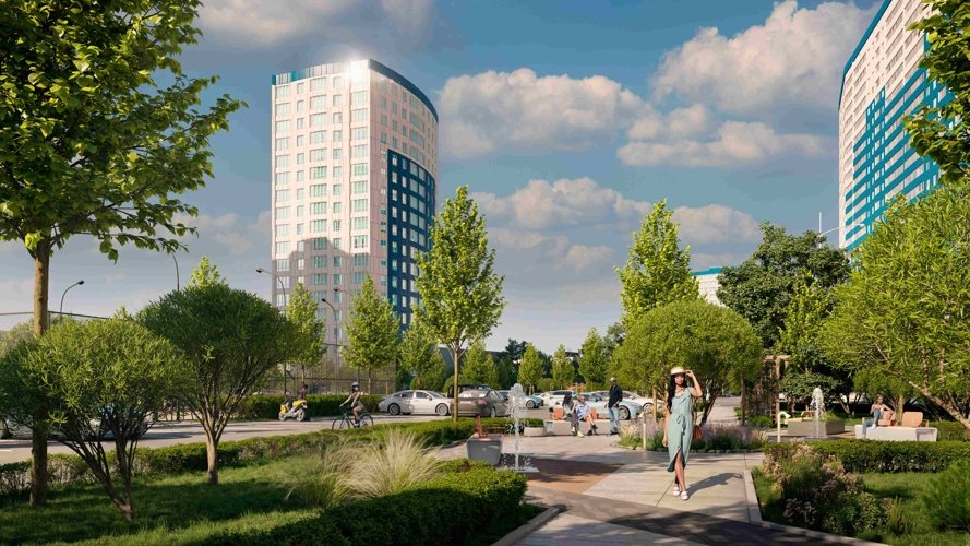 Узнаваемый почерк «Фонтанов» — дома-волны с плавными округлыми линиями. Это не просто эстетика, а продуманная инженерия: вентилируемые фасады из керамогранита в бело-голубых тонах отражают южное солнце, сохраняя прохладу в квартирах . Высота — 18-24 этажа, но благодаря скругленным балконам и панорамному остеклению здания выглядят легкими, почти парящими. Каждый корпус развернут так, чтобы максимум квартир получили виды на реку или парк.